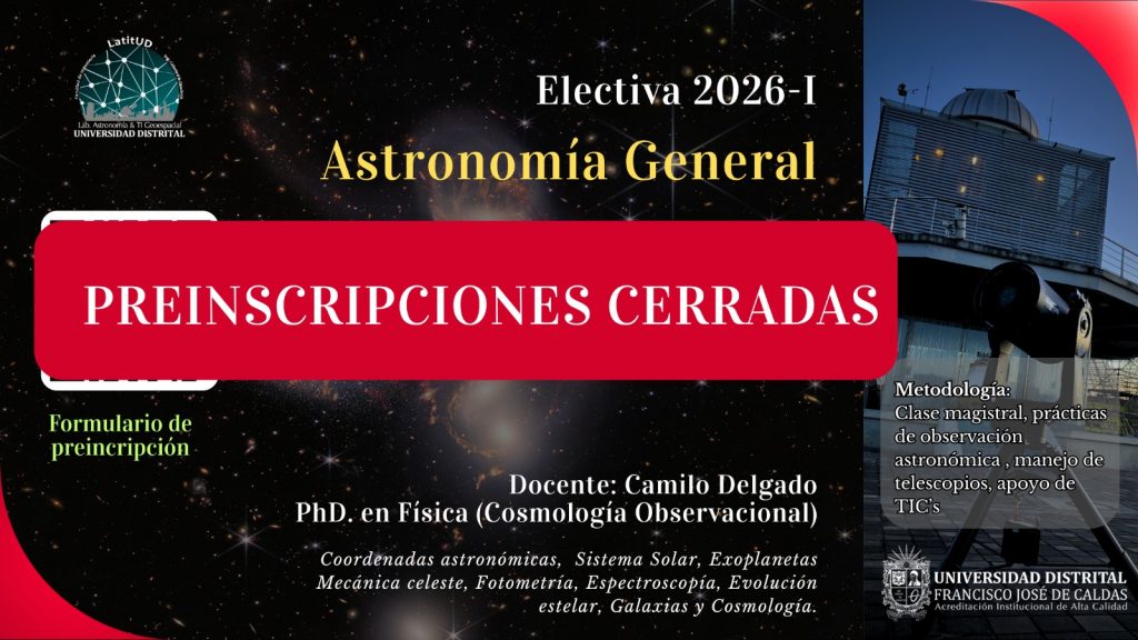 El programa de Ingeniería Catastral y Geodesia de la Facultad de Ingeniería invita a los estudiantes de pregrado de la Universidad Distrital Francisco José de Caldas a preinscribirse en la electiva extrínseca “Astronomía General” para el periodo 2026-I. El formulario cerrará el 21 de enero a medio día o hasta agotar cupos.